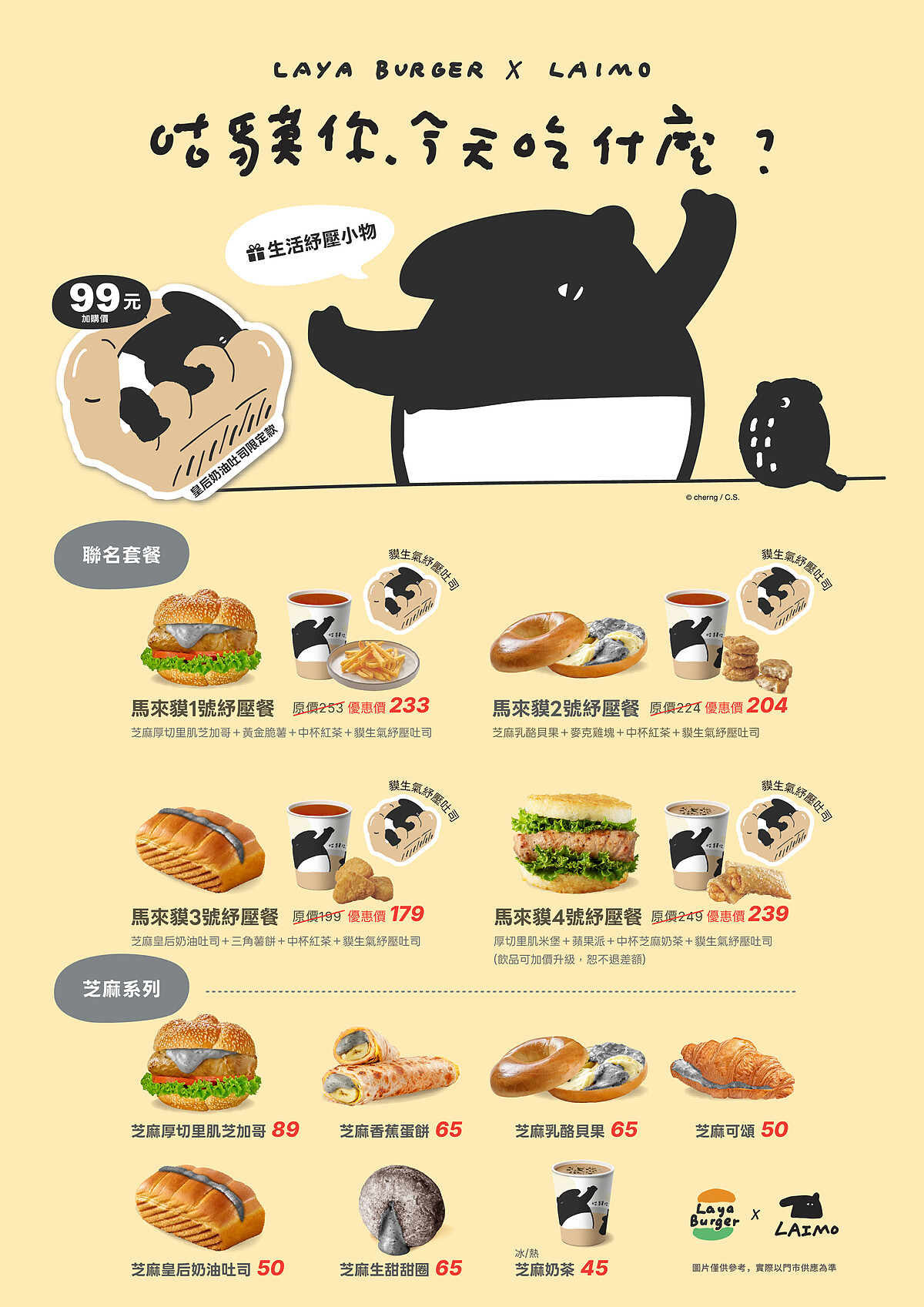 这次联名核心概念就是既然不想上班,那就把这份负能量化作好吃的动力,完全说中上班族的心声。全台拉亚门市都会换上这股黑白视觉,让你在半梦半醒的早晨找回一点点刚刚好的鬆弛感。