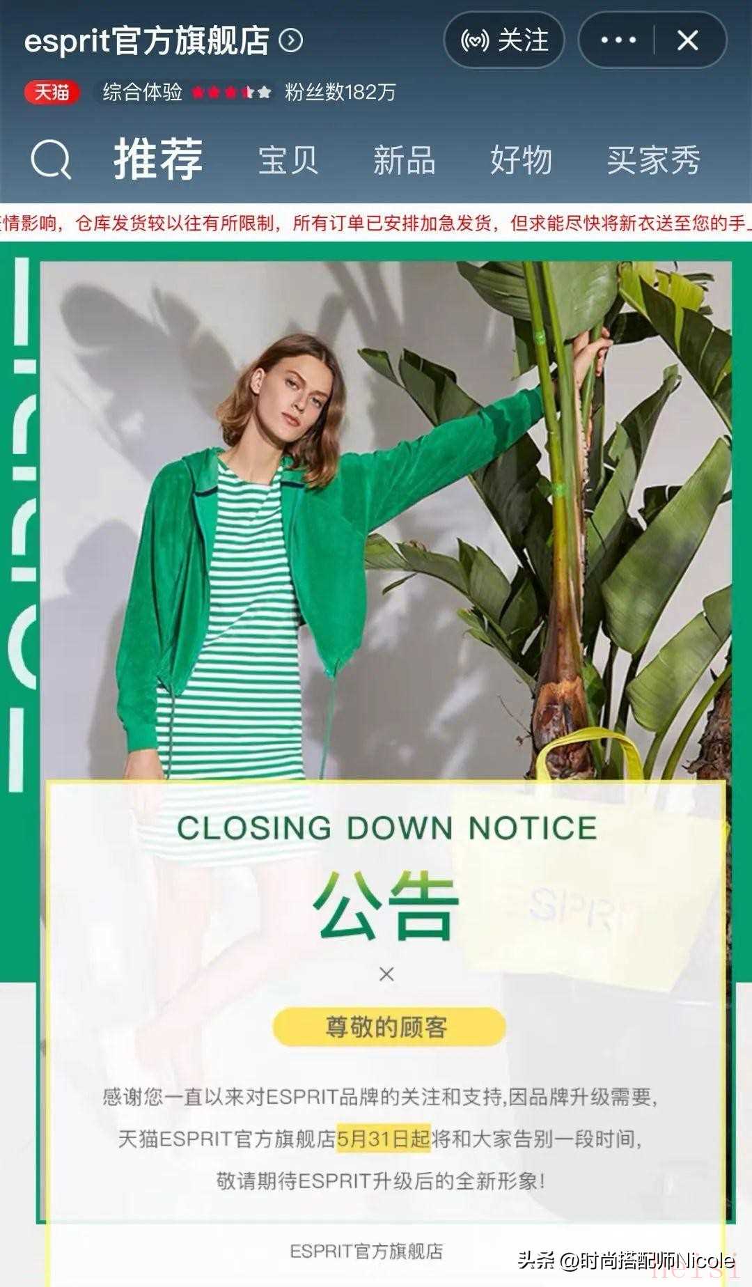 2020年4月13日,思环贸易有限公司,作为ESPRIT的母公司,宣布该品牌将于当月16日结束在中国的营业,这也意味着ESPRIT正式退出了中国市场。