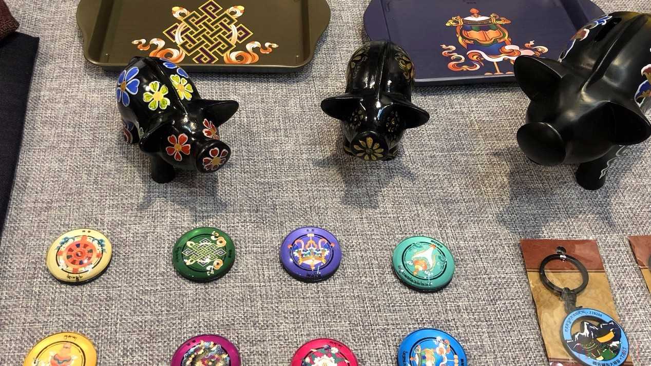 其中,几只木刻藏香猪因工艺、图案不同,引人注意。据介绍,木刻手绘藏香猪是“创意西藏”联合林芝市政府发起的精准扶贫项目之一。“创意西藏”通过唐卡画师教会部分贫困农牧民简单的唐卡绘制技巧,大家绘制好的木制藏香猪工艺品将通过平台进行售卖,所得利润再反馈农牧民。这样不仅让一部分农牧民多学习一项手艺,也在一定程度上增加了家庭收入。