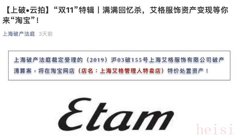 在“双十一”到来当天(11月10日),上海破产法庭公众号发布一则“双11”特辑消息,提及上海艾格服饰有限公司(以下简称“艾格公司”)破产清算案,将在网店以“全场一折”的特价处置资产。