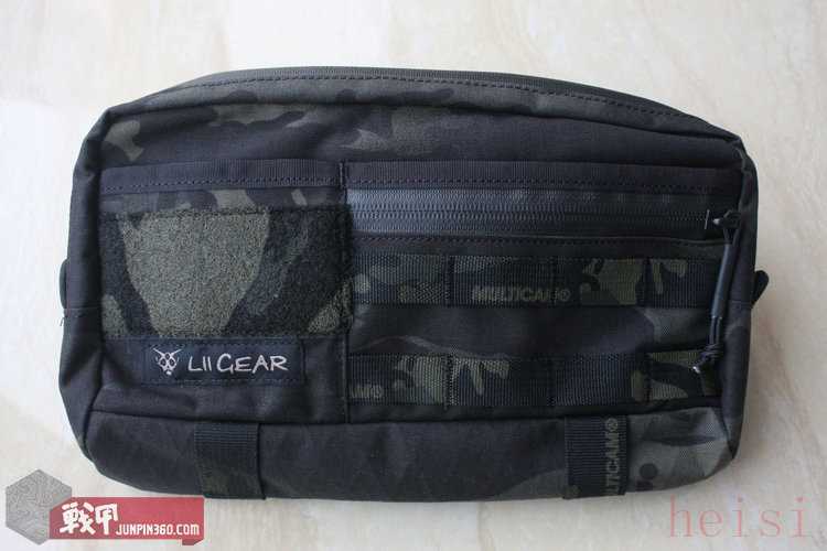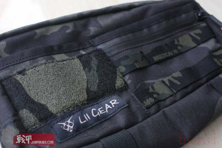简单的看完正反两面后,咱们就按照传统顺序,先从正面看起好了。从左至右总共有两个分隔口袋,左侧的稍小,外面为与面料同色的魔术贴毛面及Liigear品牌LOGO织唛,魔术贴毛面尺寸为10.5cm*5cm,对于绝大多数常规尺寸比例的士气章魔术贴什么的绰绰有余。右侧的稍大些,外面为一个拉链口袋及两行四格Molle织带,当然,Molle织带必然也是与面料同色。