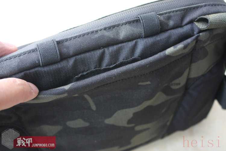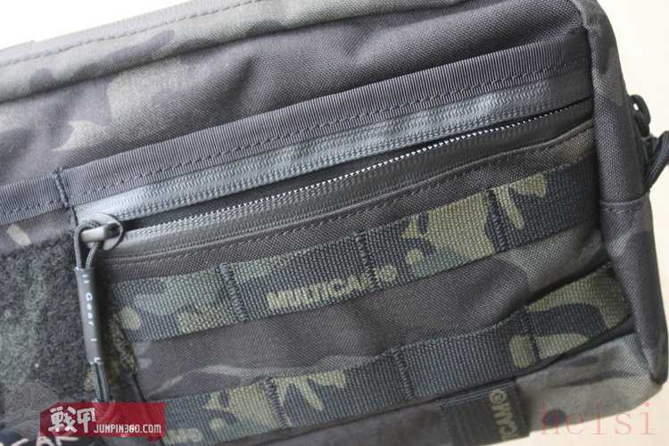 先看包包主体,正面能一目了然看到的就是多重布局的结构。与本体迷彩同色的魔术贴毛面、YKK防水拉链、品牌LOGO织唛、Molle织带等等。