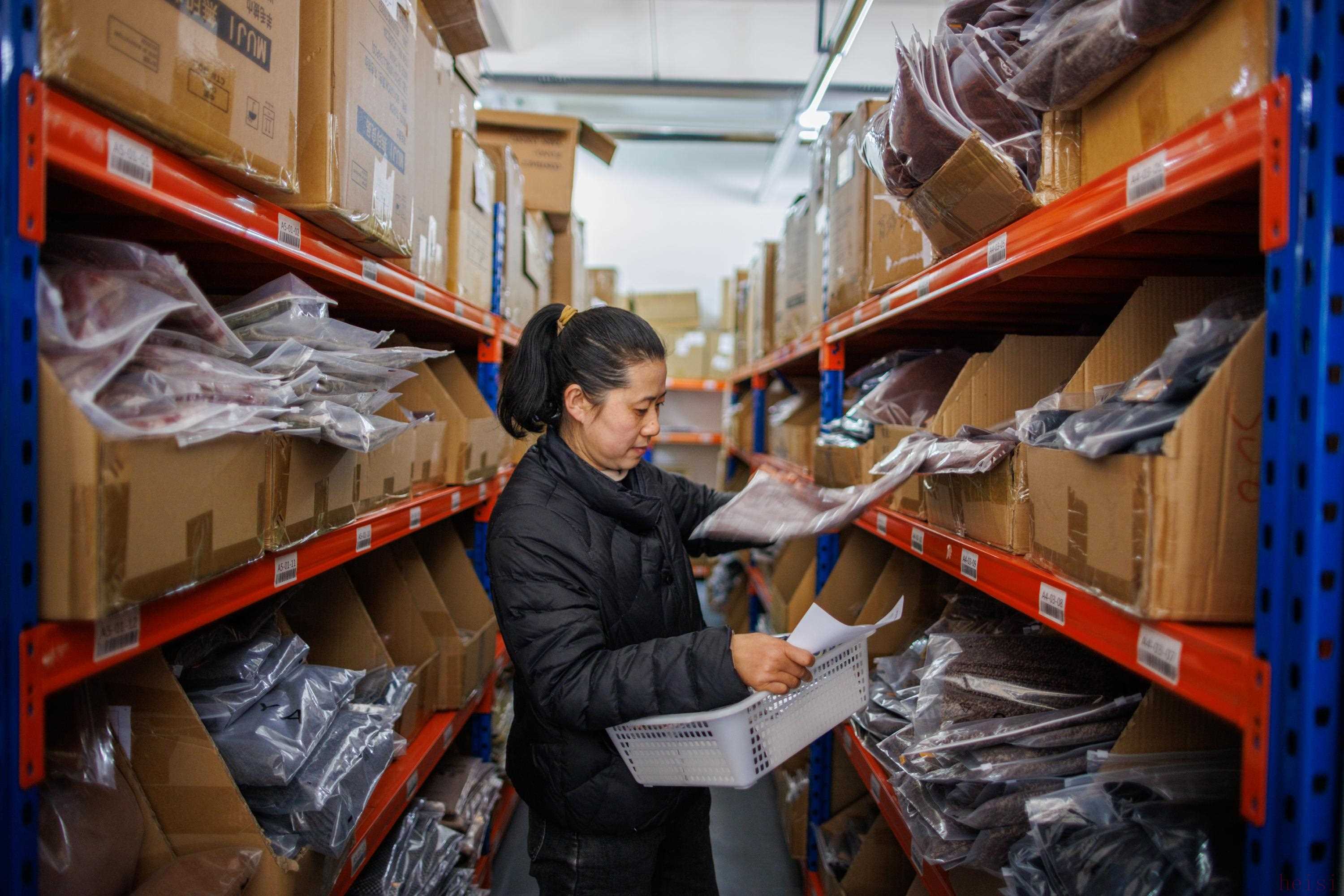 工作人员在仓库配货。
