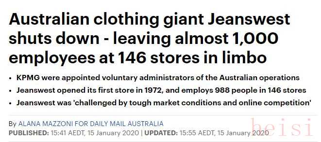 又一家巨头大溃败!曾经的服装品牌巨头真维斯(JeansWest)澳大利亚公司面临破产。