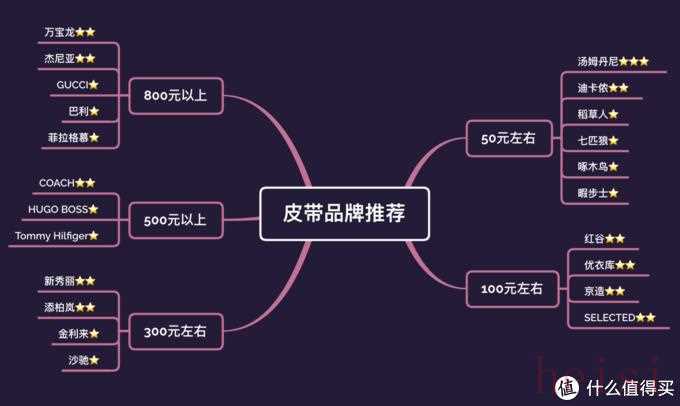 不谈预算的推荐都是耍流氓,选购皮带一个很关键的点就是预算。由于每个人的年龄段不同、经济收入不同、消费习惯不同对于一条皮带的投资会有不同的倾向。还在的读书的学生党可能需求会是选择价格适中且有个性,年纪大的中老年人可能需求是价格便宜耐用就好等等。下面个人罗列了不同价位皮带品牌的推荐: