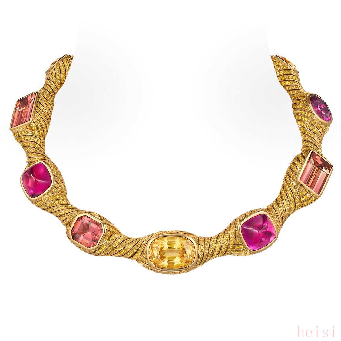 「欢悦」(Joy)主题旨在将创造力转化为强大的色彩波动——一件设计大胆的黄金项链采用螺旋形态的绳索结构,镶嵌黄色蓝宝石营造出熠熠鎏光。亮点是镶嵌总重达204.63ct彩色宝石,包括3颗黄色蓝宝石和10颗粉紫色和粉橙色调碧玺,宝石重量从10.06ct至41.62ct不等,均采用不同琢形呈现,展现让人印象深刻的色彩张力。
