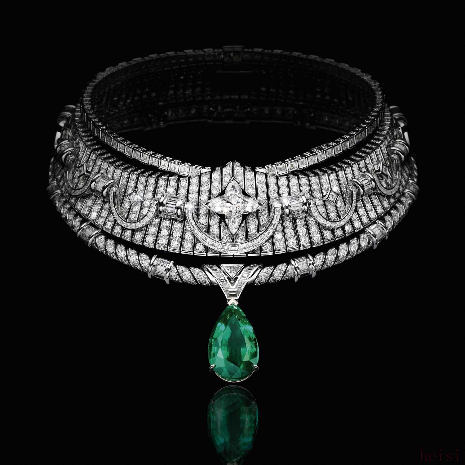 运用铂金和白金制作,主石为一颗30.75ct水滴形切割祖母绿,经鉴定产自巴西。镶嵌一颗10.56ct LV Monogram 星形切割钻石,经鉴定为 D 色和 Flawless 净度。镶嵌钻石。这件项链提供三种佩戴方式。