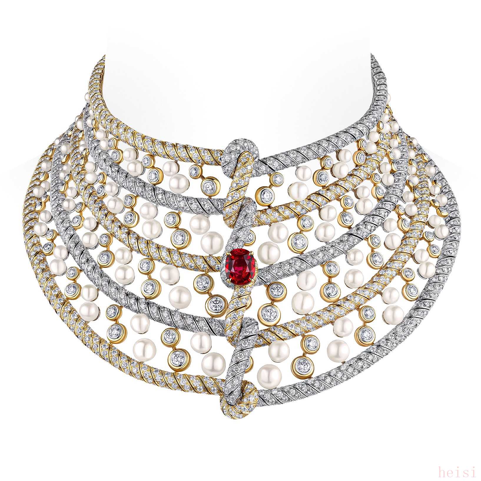 运用黄金和白金制作,主石为一颗6.04ct椭圆形切割红宝石,镶嵌114颗总重131.39ct Akoya 珍珠,镶嵌圆形明亮式切割钻石。