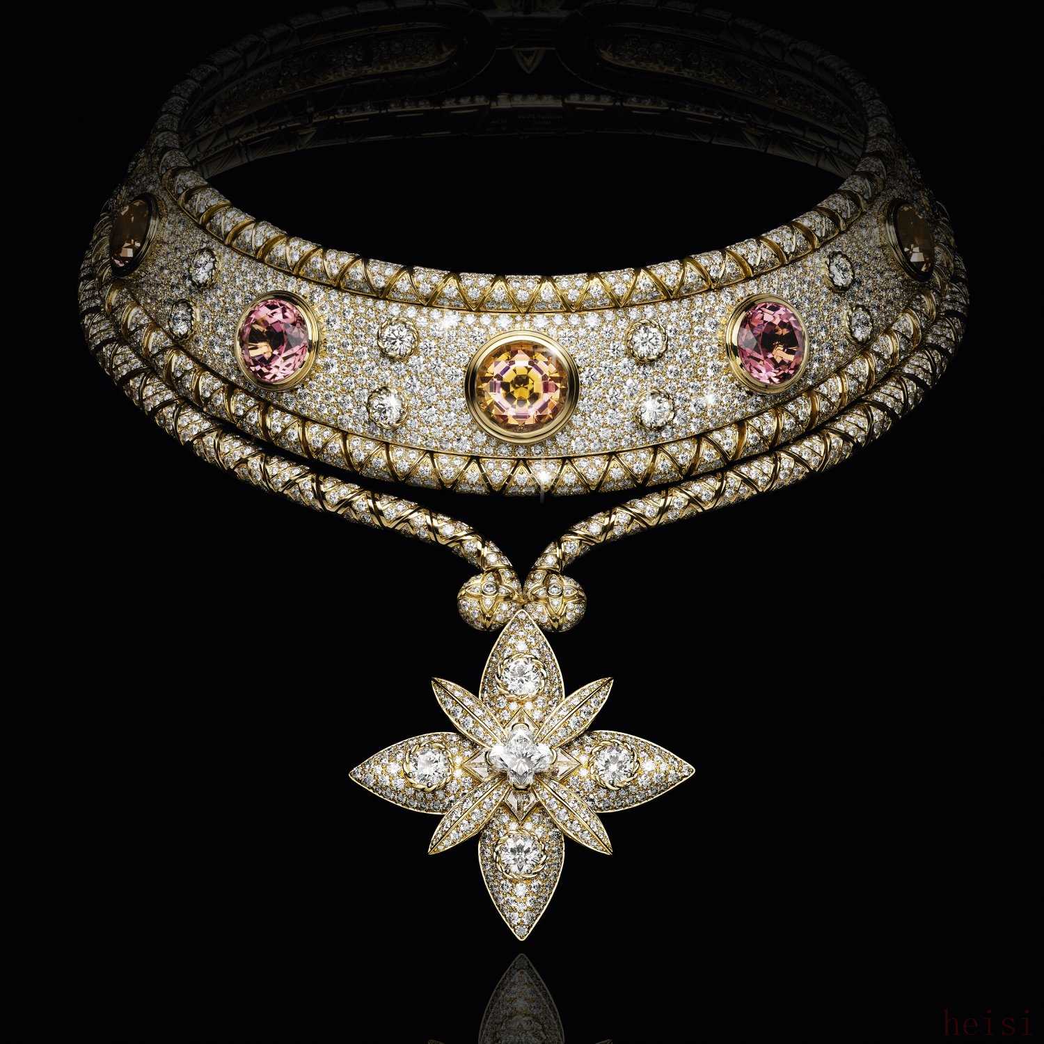 色彩和创造力所带来的动力,引导珠宝匠迎接新的愿景与启迪,继而造就「灵韵」(Aura)主题——Aura 黄金项链以品牌标志性的 Monogram 花卉和四芒星图案为主要设计元素,黄金项圈密镶璀璨钻石,镶嵌圆形切割粉橙色碧玺营造出梦幻柔美的色泽。亮点是底部垂落黄金四芒星图腾,中央镶嵌一颗2.54ct Monogram 花形切割钻石。这件项链可转换为3种不同佩戴方式。