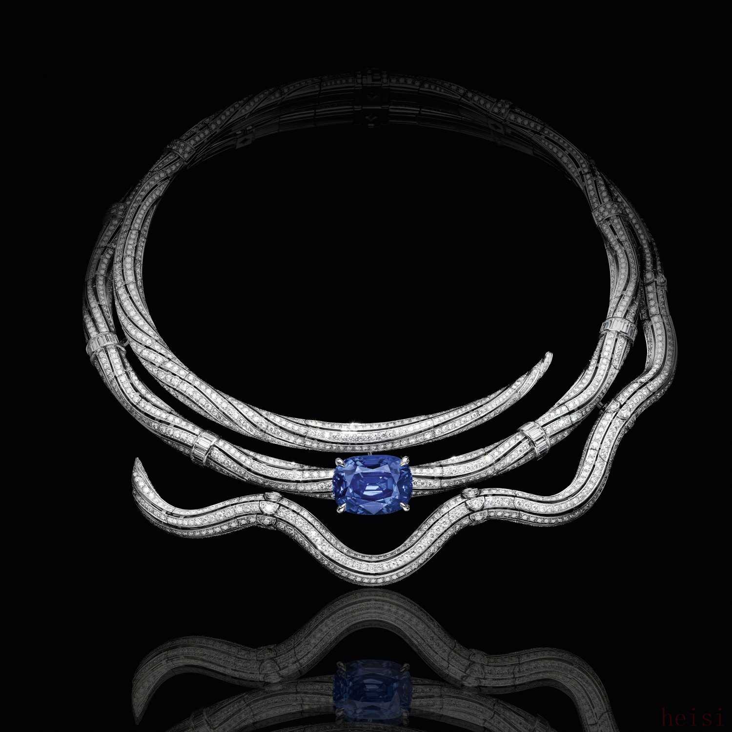第二篇章「创意天地」的首个主题为「涓流」(Motion),致敬珠宝艺术家们永不停歇的创意涌泉——Motion 三圈式项链以白金塑造出流畅起伏的波浪形态,珠宝匠历时5个月的研究,精心打造出圆润造型和排列布局,镶嵌钻石显得轻盈而充满流动感。这件项链的中央是一颗斯里兰卡产地的35.69ct枕形蓝宝石,呈现海水般深邃蓝色。