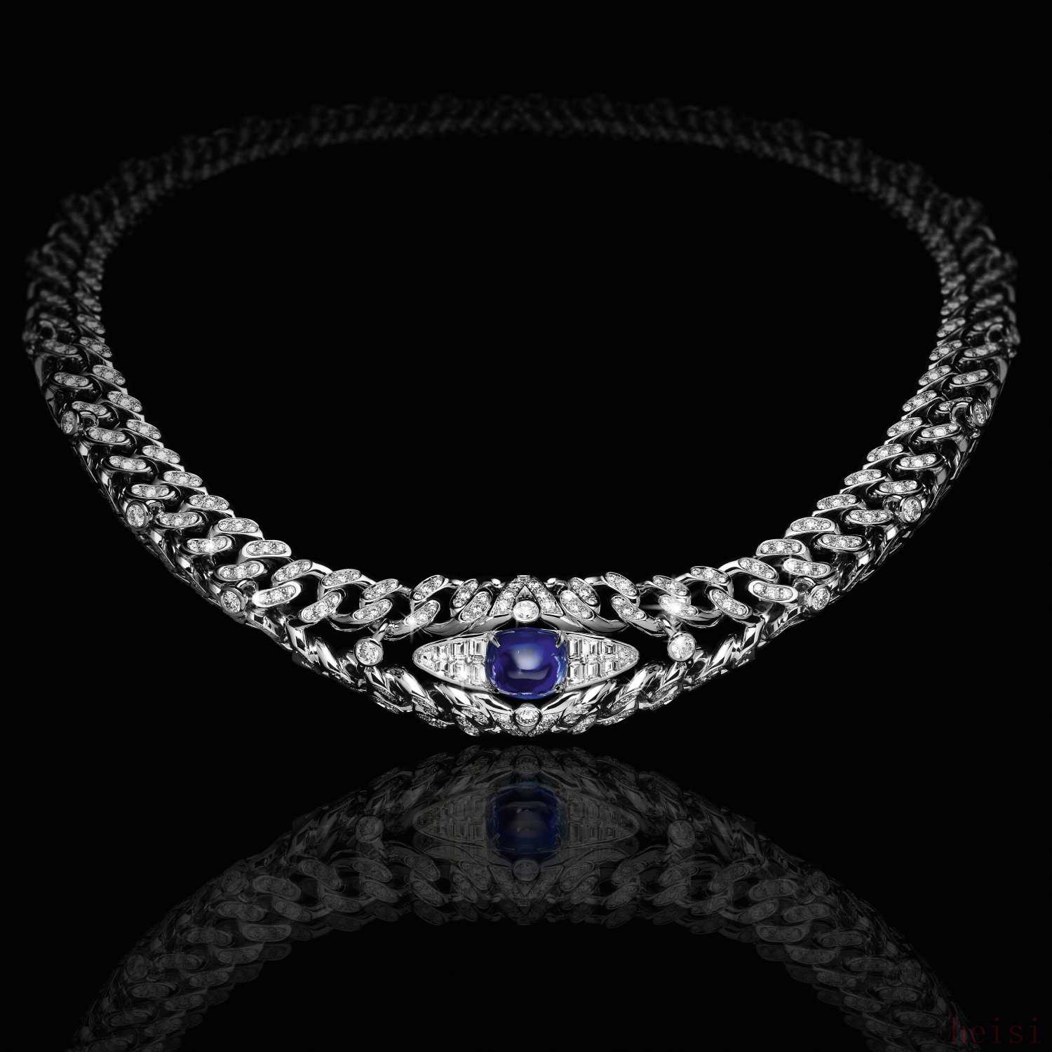 「御恒」(Keeper)主题灵感来自古埃及智慧之眼图腾,既是守护者也是旅途中的引导者——最具代表性的是一件白金项链,以一颗10.12ct弧面切割蓝宝石演绎智慧之眼的眼瞳,衬以修长椭圆形钻石图案演绎眼睛轮廓。项链采用白金镶钻塑造出立体锁链结构,你可以看到 V 字形和包镶圆钻细节,灵感源于品牌徽标和硬箱上的铆钉元素。