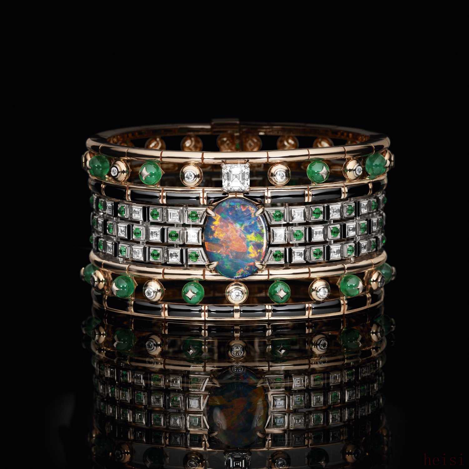 「超凡」(Monumental)主题意喻伟大的技艺需要耐心积累,从而追求极致完美——一件复杂结构的多圈式手镯作品交替镶嵌正方形切割钻石和弧面切割祖母绿,演绎品牌经典的棋盘格图案。手镯两侧点缀祖母绿圆珠和包镶圆钻更显轻盈灵巧。这件手镯的亮点是中央一颗8.4ct椭圆形弧面切割欧泊,展现绚丽斑斓的天然变彩。