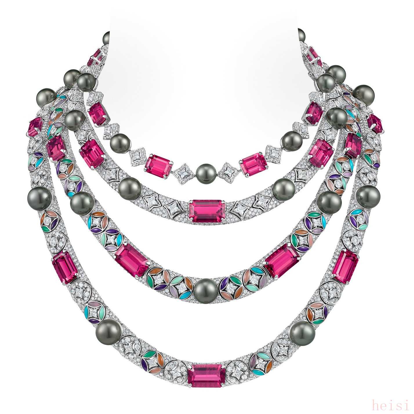 「繁花」(Florescence)主题以色彩绚丽的宝石来表达活力绽放的创造力——一件四圈式项链在弧面白金底座上密镶钻石,亮点是镶嵌20颗总重164.34ct祖母绿型切割红碧玺,34颗总重10.78ct LV Monogram 星形切割钻石,以及24颗总重258.78ct灰珍珠,展现出色的色彩层次,耗时超过2500小时制作。