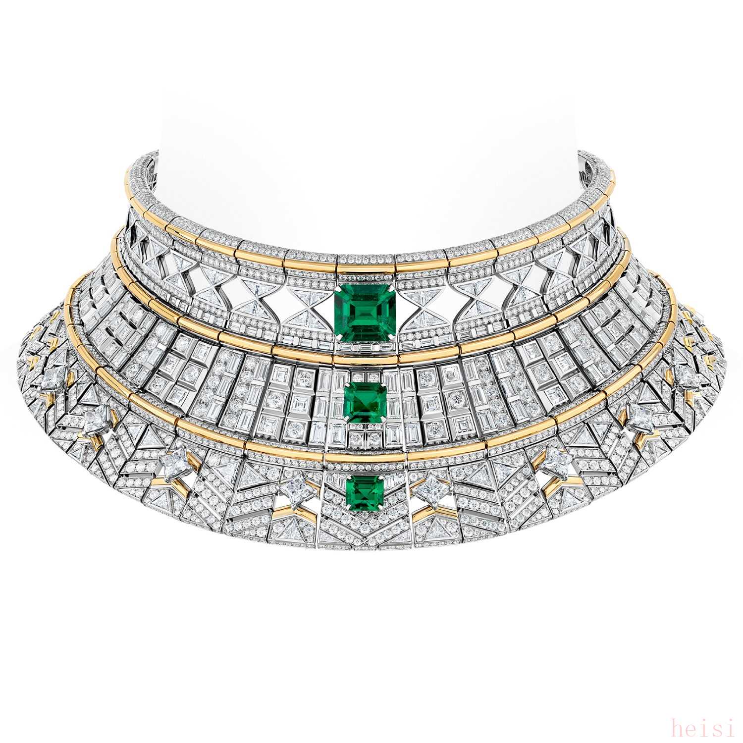 「匠神」(Maestria)主题致敬珠宝匠不断精进,追求精湛技艺与卓越品质——一款装饰艺术风格的高领项链流呈现强烈的几何对称美感,运用白金、黄金搭配钻石塑造出品牌标志性元素——镂空风筝图形、棋盘格和人字纹图案。焦点是项链中央镶嵌3颗阿斯彻切割哥伦比亚祖母绿,分别重8.88ct、3.22ct和2.1ct,展现浓郁饱和的鲜绿色。项链耗时2730小时制作。