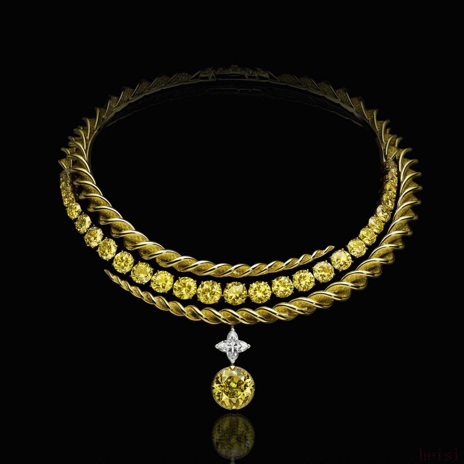 运用铂金和黄金制作,主石为一颗14ct圆形切割黄钻,镶嵌27颗总重46.13ct圆形切割黄钻,一颗3.88ct LV Monogram 星形切割钻石,镶嵌黄钻厘石。
