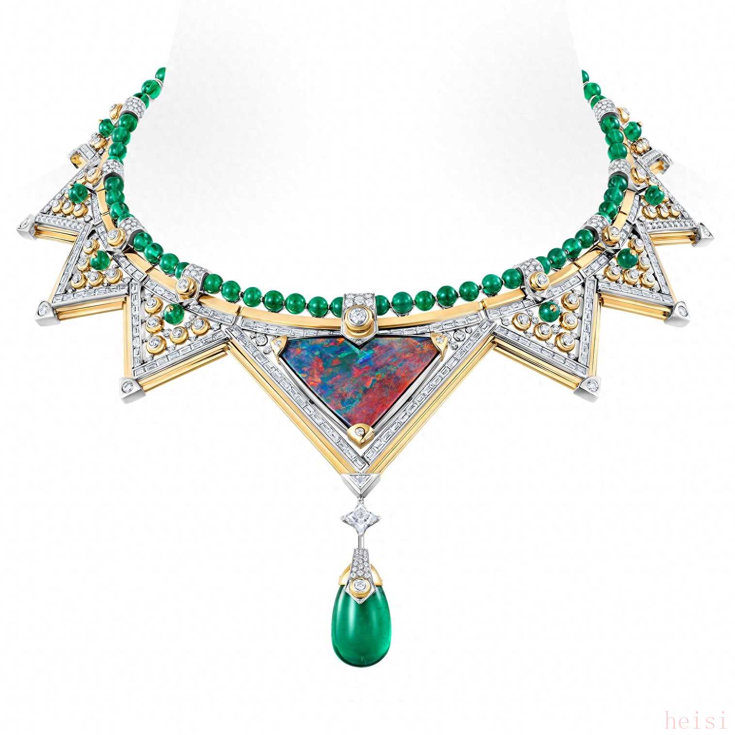 运用黄金和白金制作,主石为一颗30.56ct三角形黑欧泊切片,镶嵌一颗28.01ct水滴形弧面切割祖母绿,一颗1.09ct LV Monogram 星形切割钻石。镶嵌钻石和祖母绿圆珠。