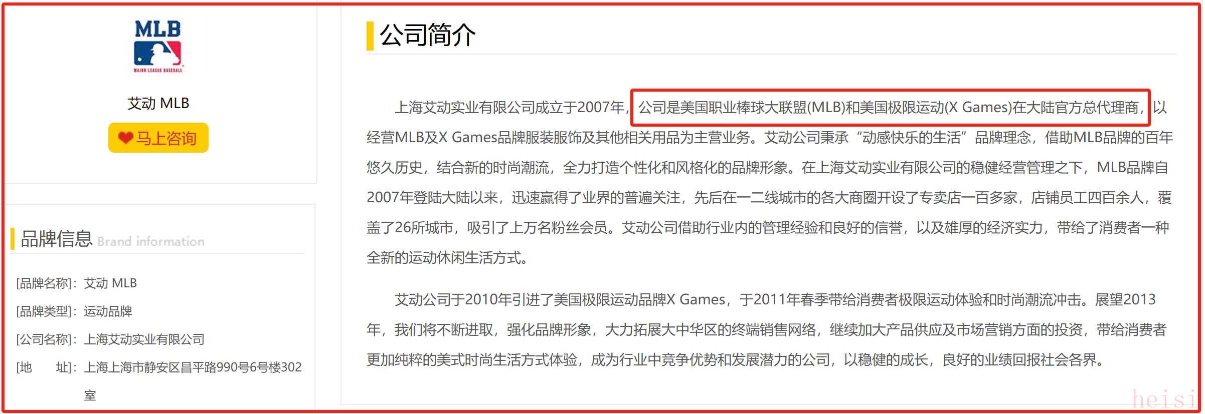 同时在中国市场和F&F集团类似的,是一家名字叫上海艾动实业的公司,他们是MLB品牌在大陆地区的授权总代理。
