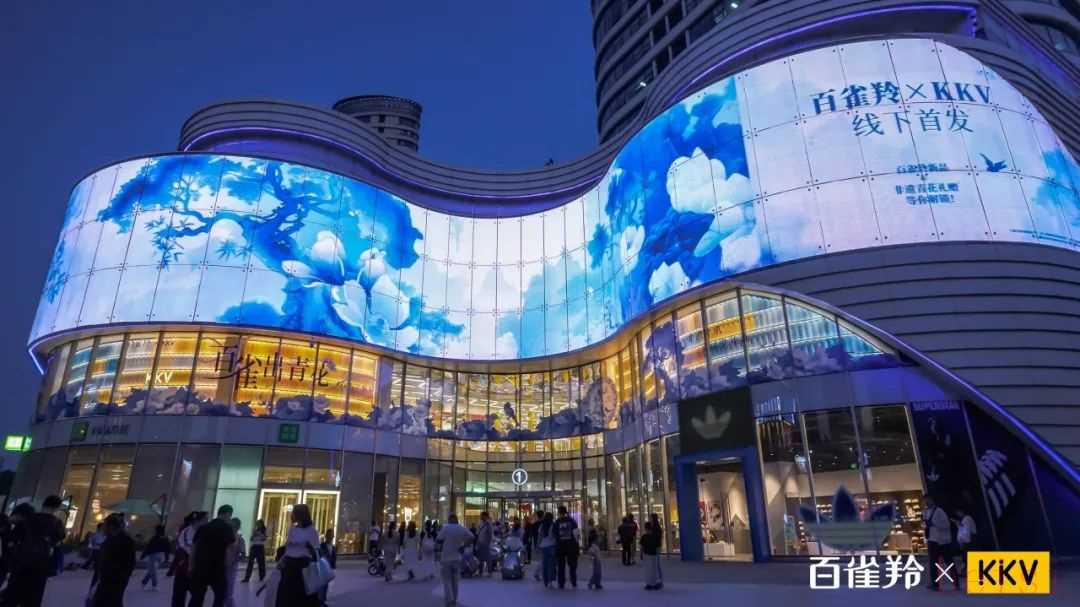 依托MOMOPARK外立面大屏巨幕和超长橱窗贴,百雀羚以视频形式讲述了青花纹样背后的护肤科技故事,不仅传递东方美学的独特韵味,更让品牌收获了城市级曝光力。
