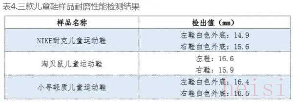 耐克儿童运动鞋等3款儿童运动休闲鞋样品耐磨性检测结果。来源:深圳市消费者委员会