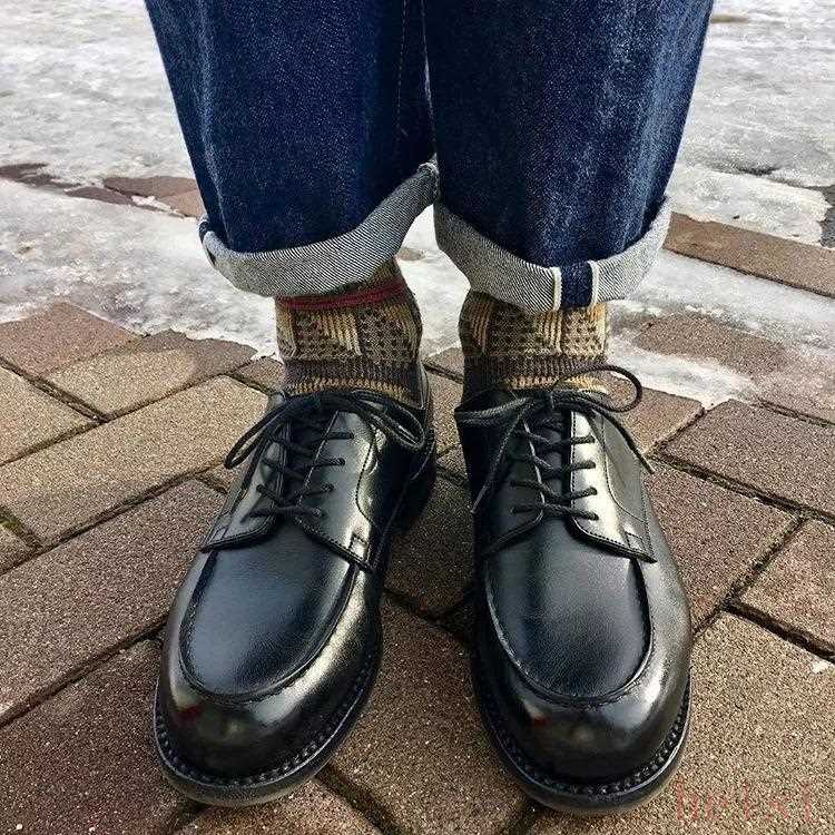 可以看到,它是以德比鞋为基础原型打造的,整体鞋型更为圆润,加持有油性皮革,穿着感觉更为薄软,但又极为耐用,有着一定的防水特性。