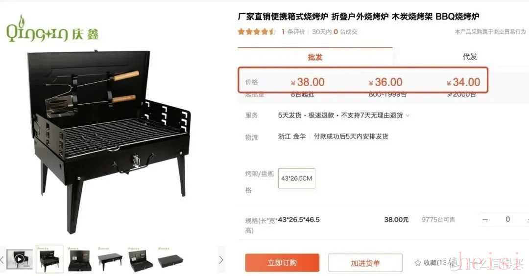 下面这个折叠烧烤炉,可折叠成一个小箱子,非常便携,批发价38元,淘宝同款价格60+,大品牌的折叠烤炉都上百,这家基本是全网最低价!