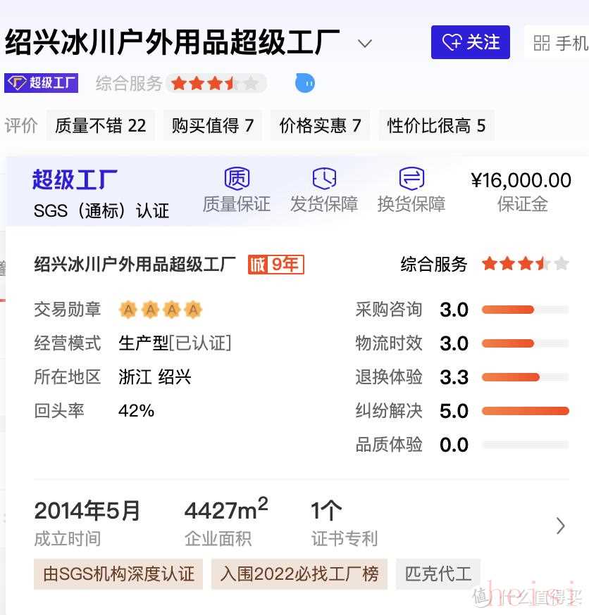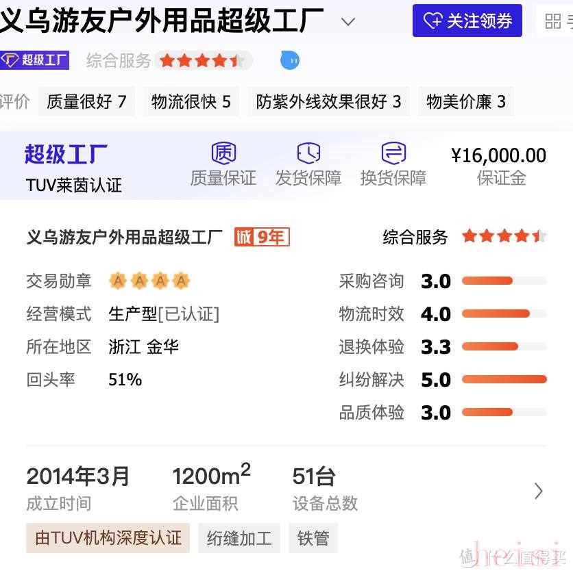 一家做户外装备的生产厂家,1688平台超级工厂认证,评价也都很不错。