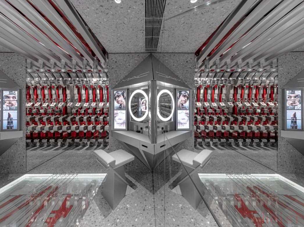 丰富的产品陈列与戏剧性的建筑营造情感联结,引导艺术灵感探索——二者在空间中激荡出情感共鸣的涟漪,彩妆不再仅限于视觉体验,听觉触觉亦是感官启迪,引领访客循五感开启探索之境 —— 让艺术成为美学体验的核心。在这里,每次试妆都是自我觉醒的序曲,每抹唇色都是个性宣言的音符。如同音乐无需翻译即可直抵心灵,这座以机械诗学构筑的"艺术舱",通过空间语法重新诠释品牌宣言:美的权利,本就该如音乐般自由流动。