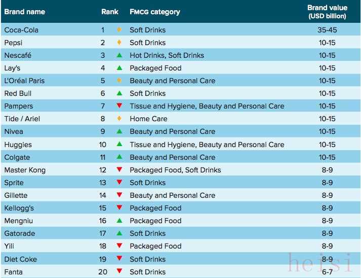 这一排名依据主要来自各个品牌在2017财年的全球零售销售额。中国品牌的最高席位被康师傅夺得(第12名),其次是蒙牛(第16位)、伊利(第18位)和金龙鱼(第24位),它们都是跻身TOP50的佼佼者。除此之外,加多宝位列第55名,娃哈哈第65名,双汇排在第76名。