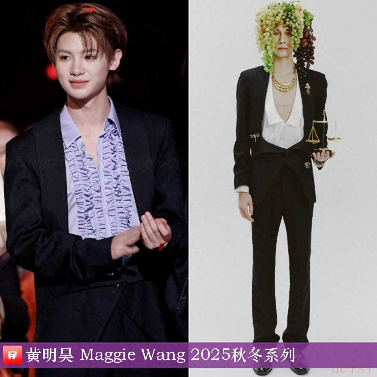黄明昊,2025年6月17日,2025电影奇遇夜。黑色荡领收腰西装:Maggie Wang 2025秋冬系列。