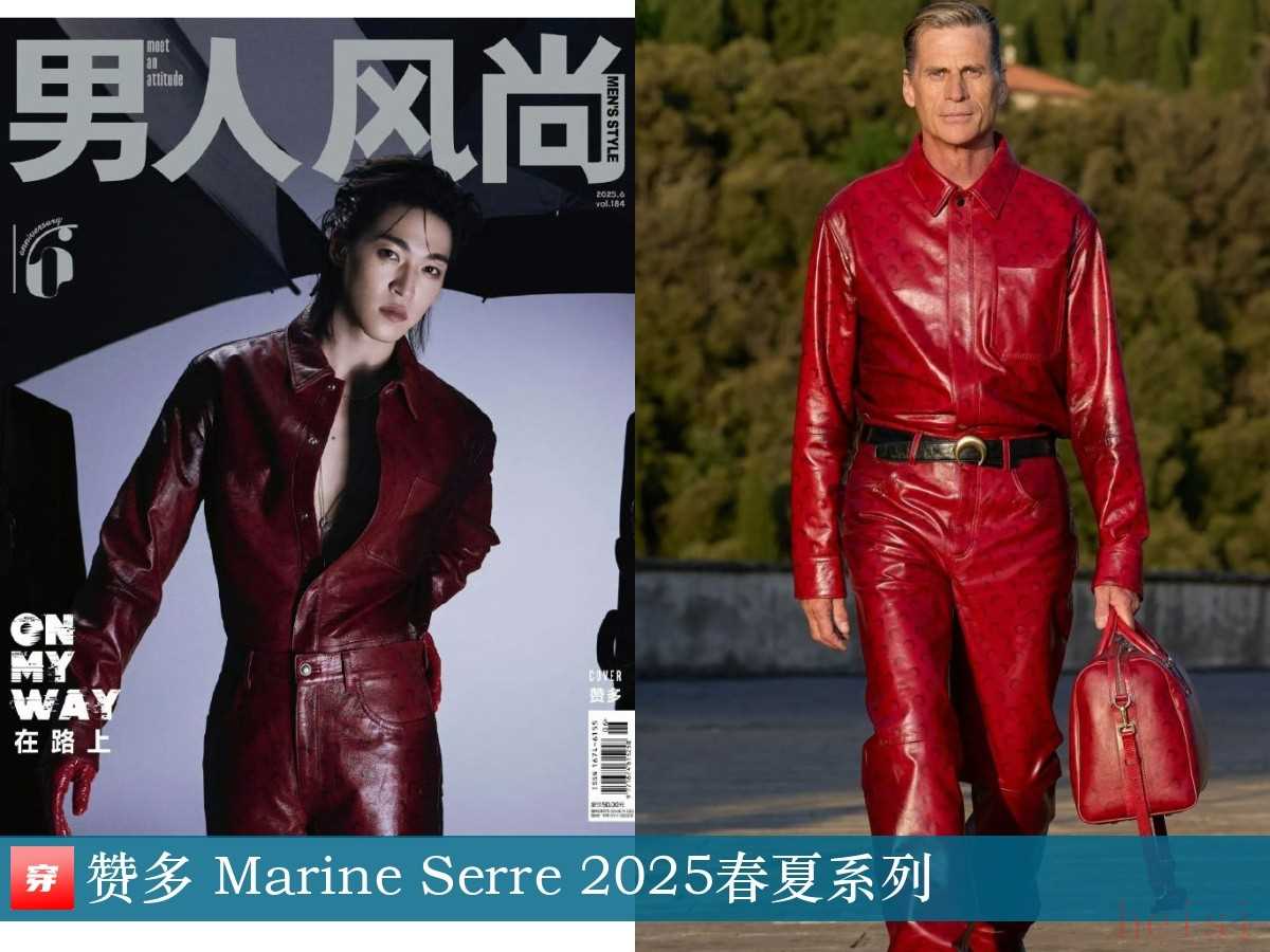 赞多,2025年7月10日,《男人风尚》2025年6月刊。红色印花皮革衬衣、皮裤套装:Marine Serre 2025春夏系列。