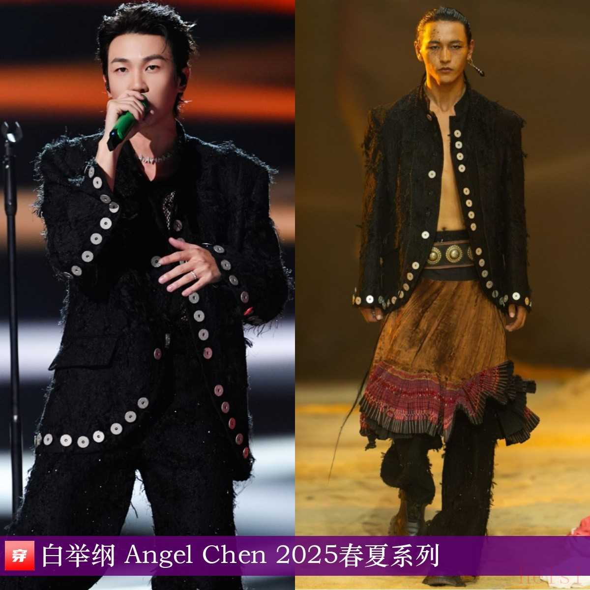 白举纲,2025年8月1日,《歌手2025》。黑色羽毛装饰立领夹克:Angel Chen 2025春夏系列。