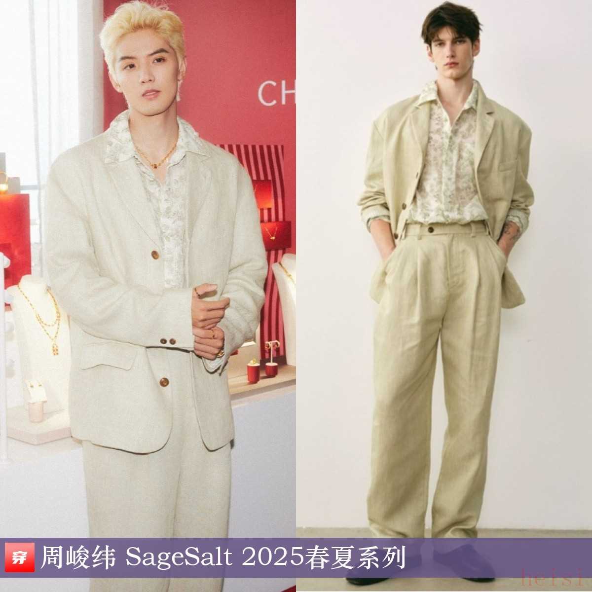 周峻纬,2025年8月2日,品牌活动。米色印花衬衣、米色西服套装:SageSalt 2025春夏系列。