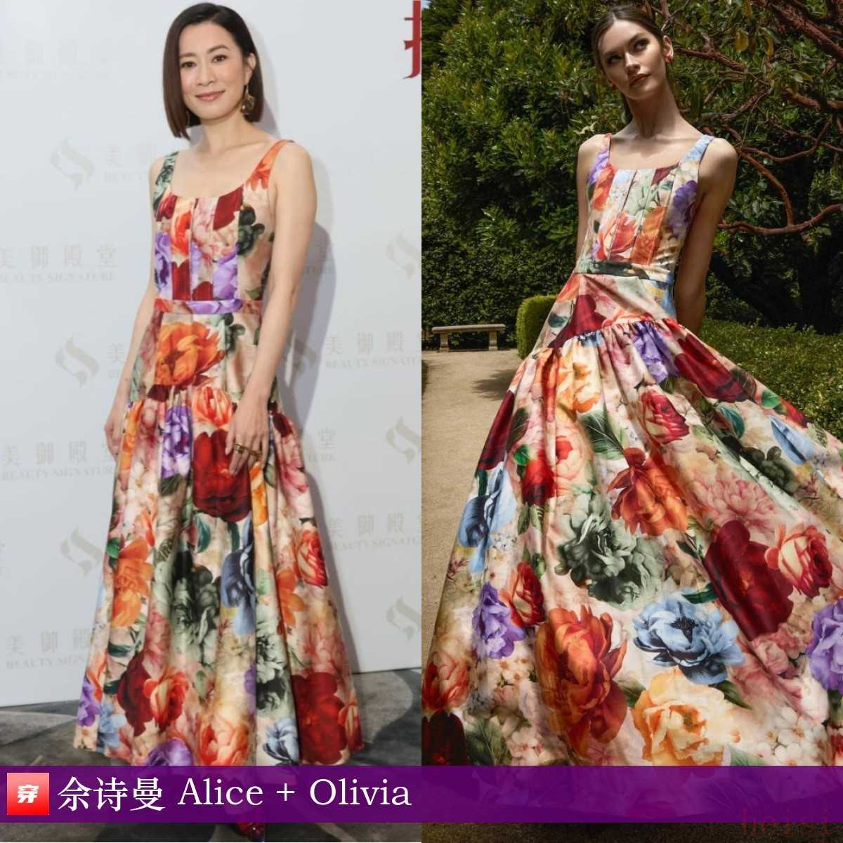 佘诗曼,2025年8月2日,美容店开幕活动。多彩繁花印花背心式连衣裙:Alice + Olivia。