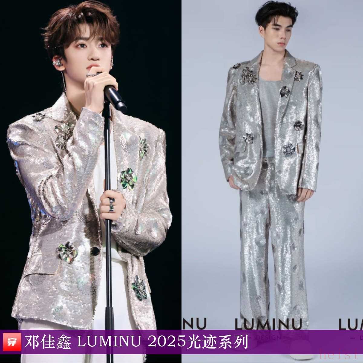 邓佳鑫,2025年8月1日,TFING「WONDERLAND梦·始」演唱会。立体花朵装饰银色亮片西装:LUMINU 2025光迹系列。