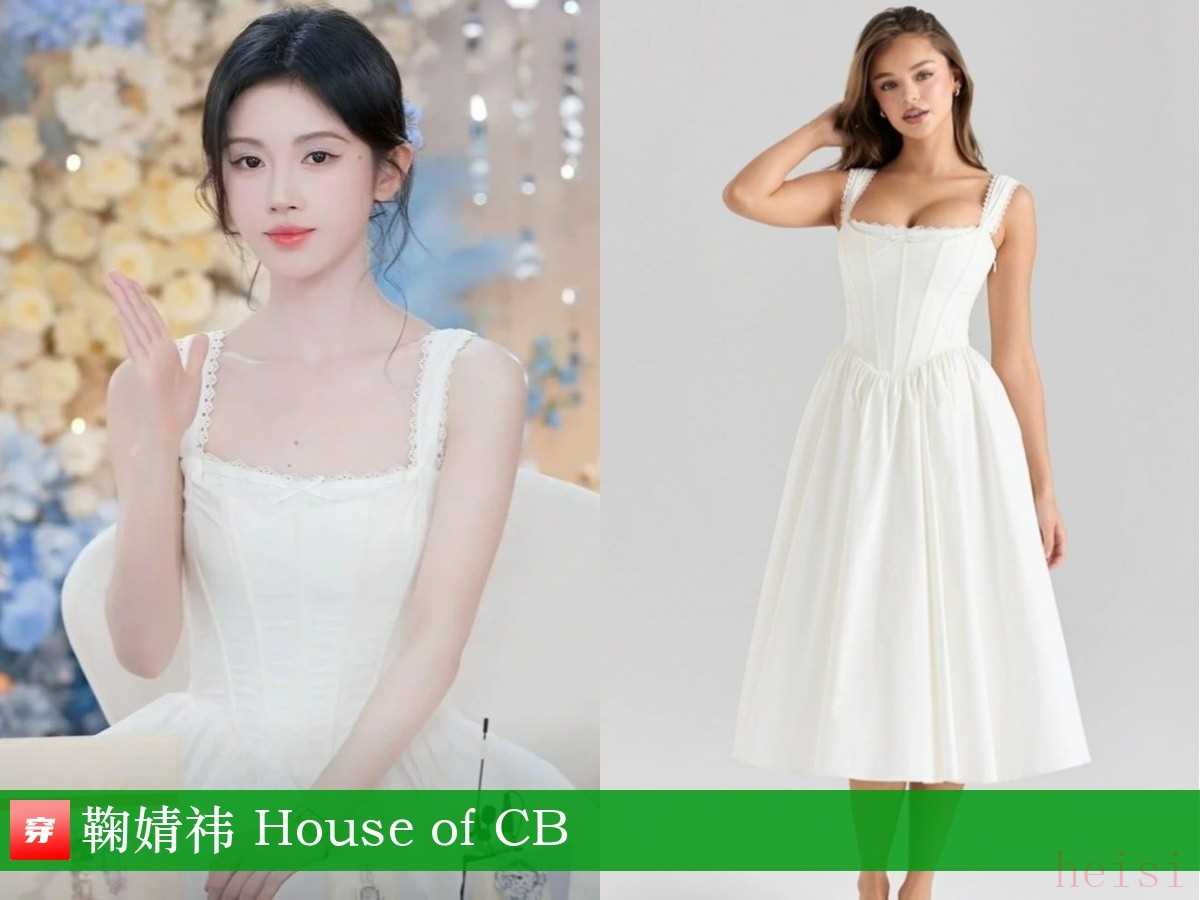 鞠婧祎,2025年8月3日,品牌直播活动。白色束腰宽肩带吊带连衣裙:House of CB。