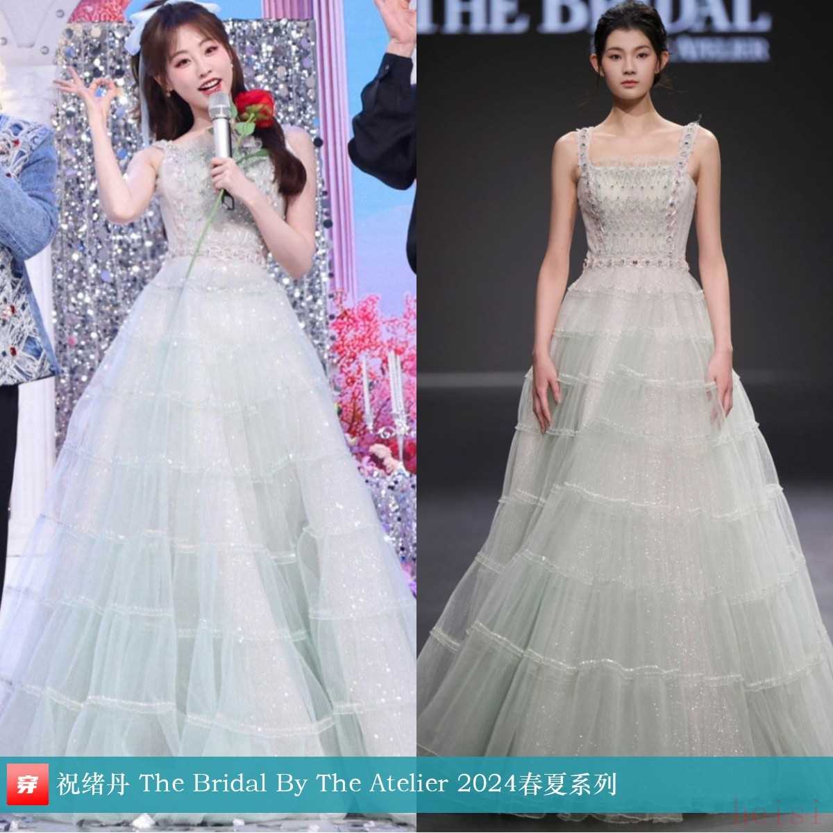 祝绪丹,2025年7月19日,《你好星期六》。淡绿色钻饰网纱吊带裙:The Bridal By The Atelier 2024春夏系列。