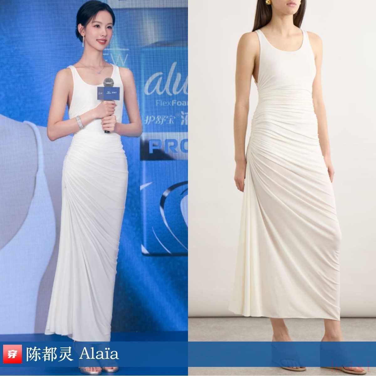 陈都灵,2025年8月3日,品牌活动。白色皱褶背心式连衣裙:Alaïa。