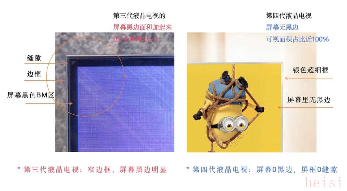 作为一台“音画双绝”的电视,电视的可视面积是提升观看体验的重要指标,从第三代液晶电视诞生10年来,各大厂商都在”黑边“(BM区)上重点发力,尽可能地扩大电视的可视面积,让用户观看内容不再损失“小细节”,更具冲击力与沉浸感。