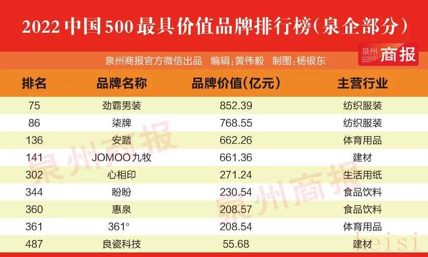 根据2023年《中国500最具价值品牌》排行榜单,来自泉州的以下9个品牌成功上榜: