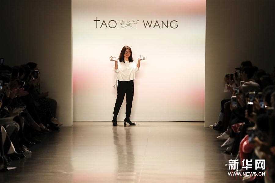 2月10日,在美国纽约时装周上,Taoray Wang品牌设计师王陶向观众致谢。 当日,由中国设计师王陶设计的Taoray Wang品牌时装亮相2018纽约时装周。 新华社记者李木子摄