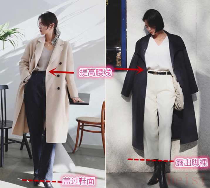 "风格效果:" 烟管裤带有一定的复古浪漫感,与羊绒大衣的温柔气质相得益彰。它的设计感比直筒裤更强,裤腿略