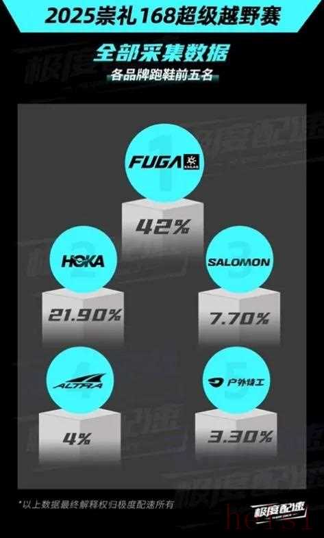 据“极度配速”统计,在今年的崇礼168超级越野赛上,凯乐石FUGA以42%的比例成为了全场越野跑鞋穿着占比最高的运动品牌。Hoka和Salomon分别以21.9%和7.7%的占比位居第二、第三位。除此以外,凯乐石FUGA也是登上168KM、100KM和70KM领奖台运动员中最多人选择的鞋款品牌。其中,夺奖运动员中,穿凯乐石FUGA的占6人,Nike和Adidas各占3人,Salomon和李宁各占2人,Hoka和安踏各占1人。上述跑鞋穿着率数据的精确度可能有待讨论,但品牌占比分布排列基本符合现场直觉。也就是说,在崇礼168赛事现场的普遍印象是,跑者相对更倾向于专精越野跑本身的品牌。
