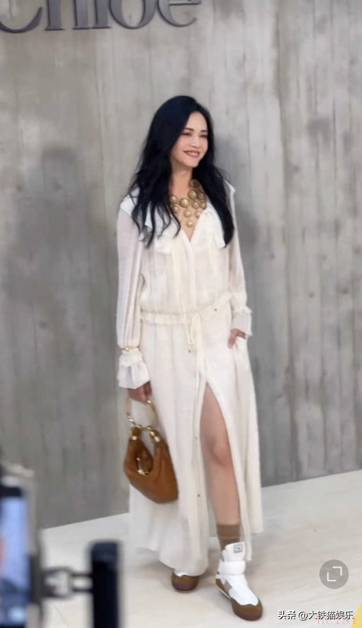 姚晨一袭波西米亚风白裙披搭大波浪卷,露出她标志性的笑容,轻松拿捏时尚感。更让人惊讶的是,其他的明星大多都是脚踩高跟鞋,她穿了个运动鞋就水灵灵地去看秀了,整个透着一种轻盈和舒展。