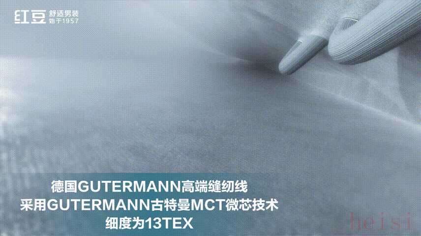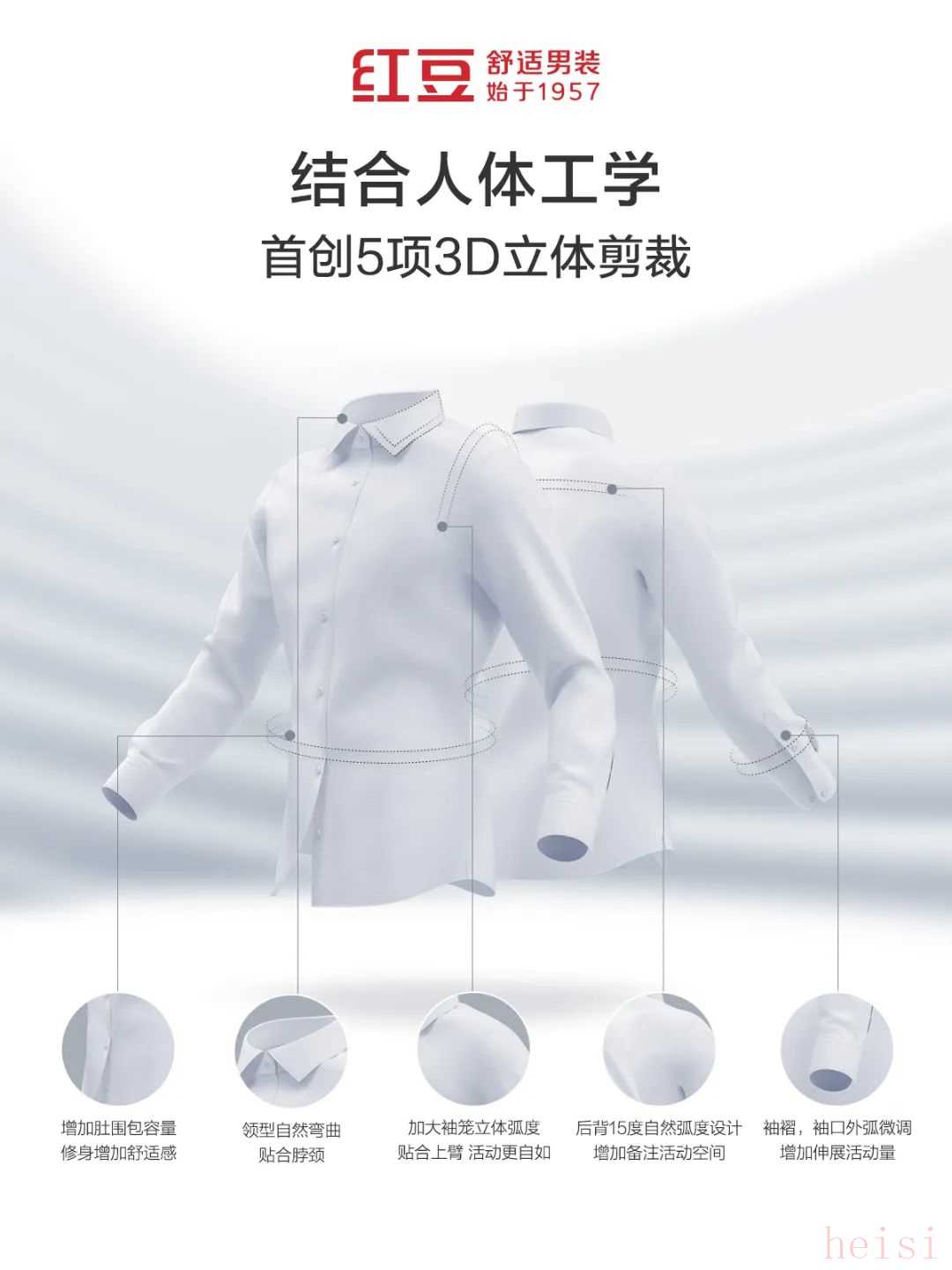 它采用了红豆首创的5项3D立体剪裁,结合了人体工程学,在领子、袖笼、袖口、腰部、后背五处进行3D立体剪裁。