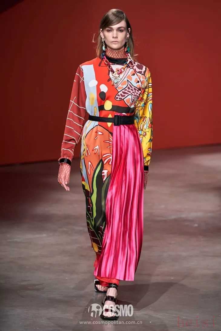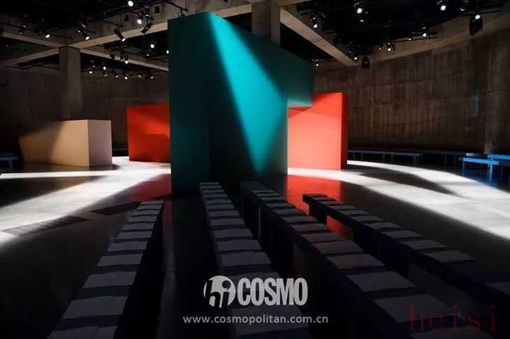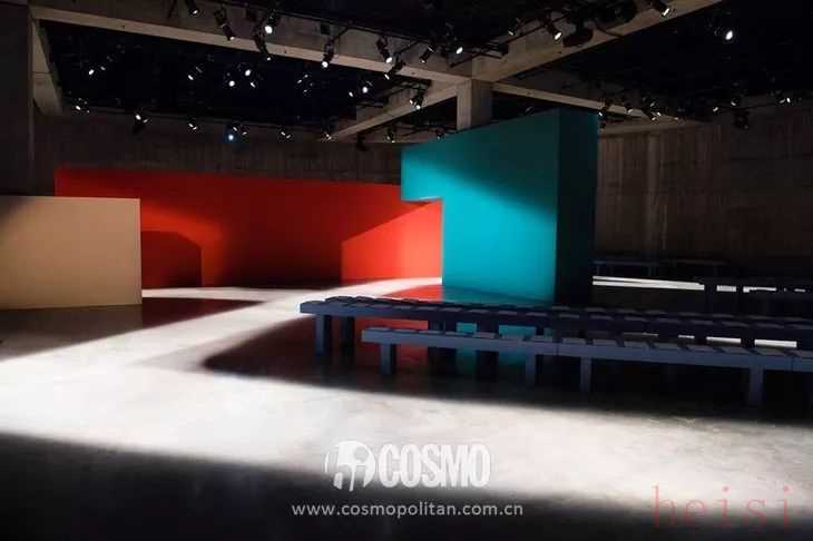 T台从巨大的红蓝撞色装置中延伸出来,在原始的水泥地中展开。这里有一种融合的氛围——从经典传统中窥见现代摩登,让它们的多样性互相结合起来。