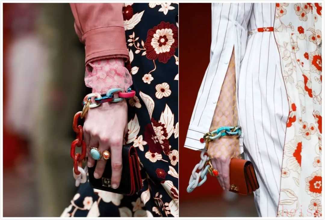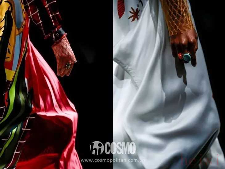 五彩斑斓的戒指,与衣服的颜色大相径庭,让人看到了碰撞的魅力。