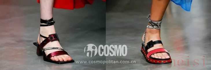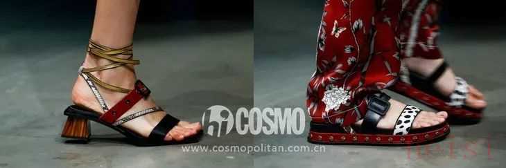 凉鞋的花纹与配色,绑带和鞋跟的交汇,金属光泽配件的点缀,精致细节穿出来。