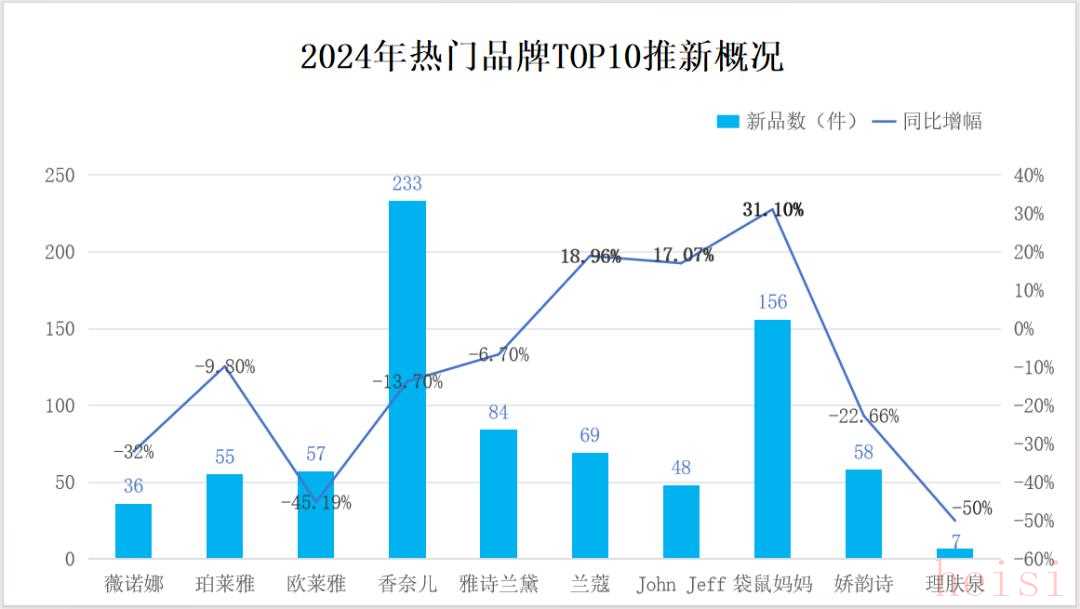 2024年热门品牌TOP10榜单中,跻身第一的薇诺娜(美修指数100)只注册备案了36件新品,同比下跌了32%;新品数最多的是排名第四的香奈儿,注册备案了233件新品,同比下滑了13.7%;推新数跌幅最大的则是理肤泉,相较于2023年,2024年新品数近乎腰斩。