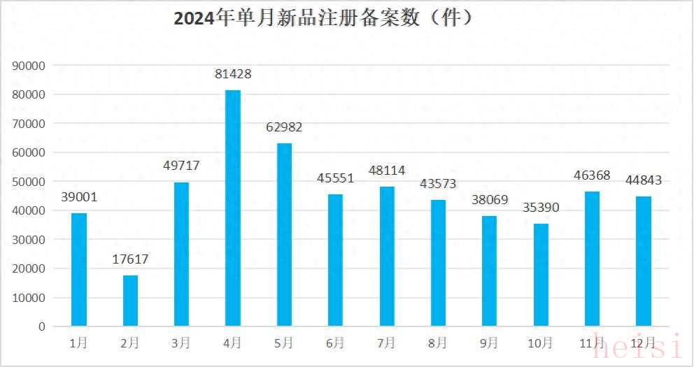 具体而言,2024年上半年新品注册备案量跌宕起伏,下半年整体呈平稳态势:受春节假期的影响,新品注册备案量在2月跌入谷底,不足2万件;3月开始回暖,4月注册备案量达到顶峰,新品数环比增长63.78%至81428件,这或与化妆品完整版安评原计划于5月1日起实施有关,致使企业都抢在节点前完成注册备案以赶上“简化版安评的末班车”。
