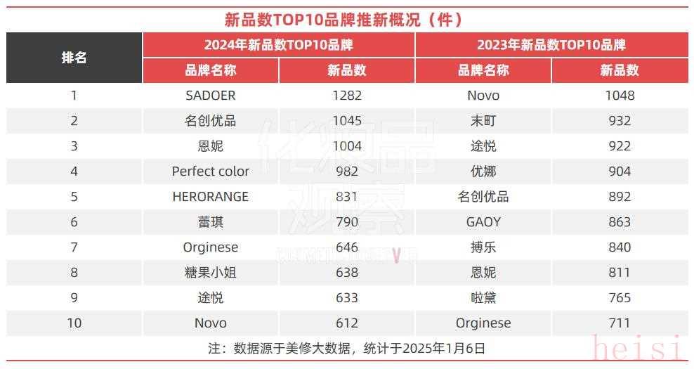 具体到品牌端,2024年,注册备案新品数最多的TOP10品牌分别是SADOER、名创优品、恩妮、Perfect color、HERORANGE、蕾琪、Orginese、糖果小姐、途悦、Novo,其中,排名前三的品牌均推出超千件新品,SADOER以1282件新品跻身新品数TOP10品牌榜首。